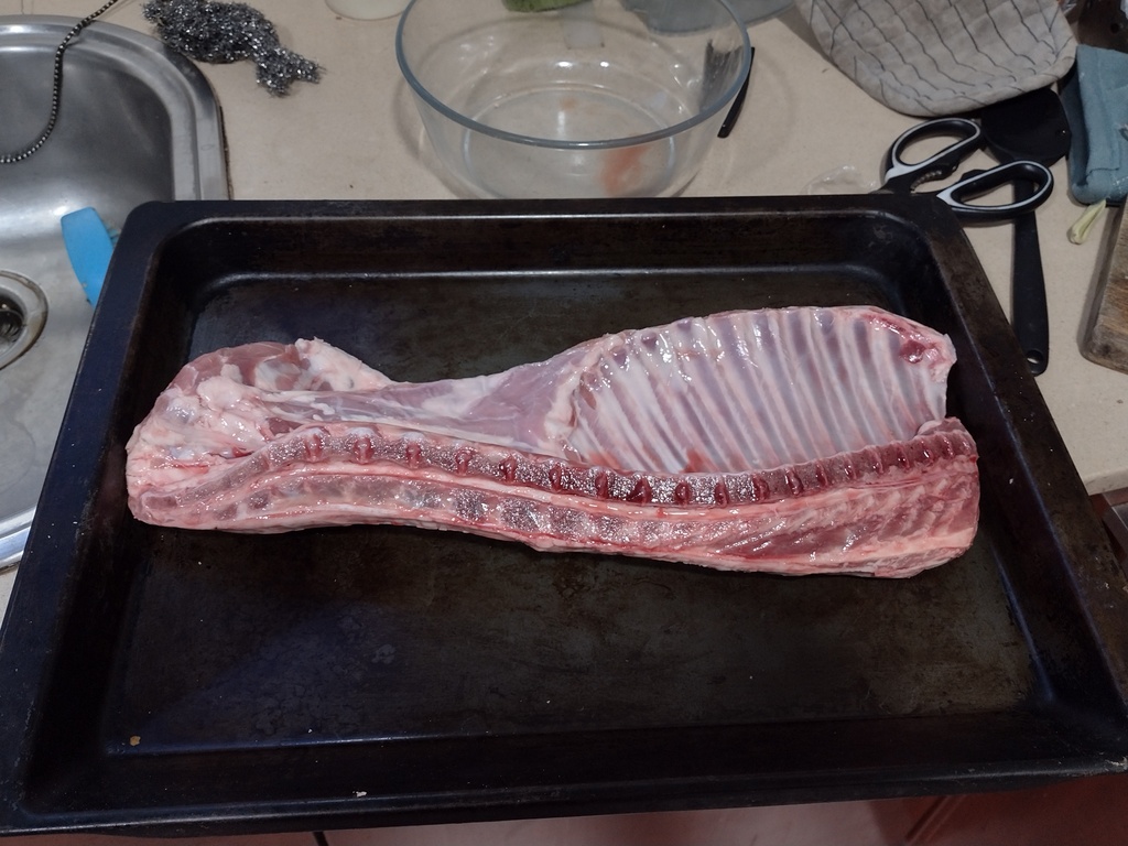 Treure el costellam de la nevera una hora abans. [Pelar les costelles i marcar la columna per que es pugui separar després.